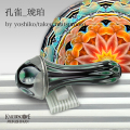 【孔雀_琥珀_グリーン】 ベネチュアンガラスのミルフィオレを巧みに加工し、グリーン黒白の孔雀の羽のようなボディーをつくりました。 中はグラデーション鮮やかな琥珀色のイメージ展開、ラージタイプなので映像も大きく見応えがあります。 先端が回転するので指先を添えてゆっくり回してお愉しみください。 松本氏から・・・ 10年ほど前に、イタリアのムラーノ島のガラス工房で買ってきた、ベネチュアンガラスのミルフィオレを使ってボディを作りました。 ミルフオレをデザインして、厚いガラス板を電気炉で作ります。 それを、ドーナッツ状に穴を開けたステンレス板の上において、電気炉でじっくり時間をかけて熱すると中空の筒ができます。 その上下をカットして孔雀の羽のようなデザインの万華鏡ボディを作りました。 電気炉の温度管理が難しいのですが、何本も失敗して貯めこんだノウハウと筒状ガラスをカットするのにとても神経を使います。 中の映像は自然光と白色LEDを補助的に使用して撮影しました。 ※オブジェクトの自然な色味が出る自然光に勝るものはありませんが、オイルセルの透明部分に、スタンドなどの明かりがあたるようにご覧になっても明るく鮮やかな色模様がお楽しみいただけます。 ガラス製スタンドが付きギフトボックス入りです。 ※実際のお色とPC上に表示される色合いは若干異なる場合がありますのでご了承ください。 ※専用の黒いボックス付きです。 |